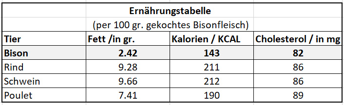Bisonfleisch hat einen wunderbaren, leicht süsslichen Geschmack. Es ist von Natur aus zart. Wenn Bisonfleisch unsachgemäss gekocht wird, dann wird es zäh und trocken. In der Küche wird es grundsätzlich wie Rindfleisch verwertet, aber es hat eine kürzere Garzeit. Das Fleisch sollte langsam und bei niedrigen bis mittleren Temperaturen gekocht oder gegrillt werden. Die kürzeren Garzeiten ergeben sich, weil Bisonfleisch weniger Fett hat und die Fleischfasern feiner sind als beim Rindfleisch.